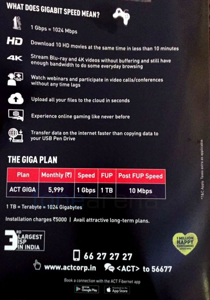 ACT Fibernet claims to be the largest non-telco internet service provider (ISP), uses fiber optic technology, and its 1 Gbps offering is 400 times faster than the average internet speed of 2.5 megabits per second in India. By using this broadband, you can download 10 HD movies at the same time in less than 10 minutes. You will be able to stream Blue-ray and 4K videos without buffering.