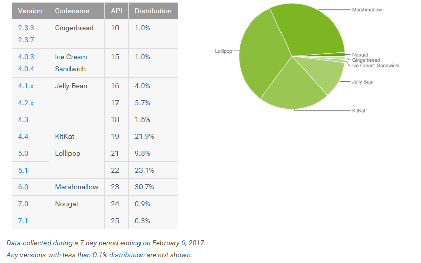 Google has released the latest data about Android OS distribution for the devices running different Android version. This gives the information about the relative number of devices running a given version of the Android platform. And for the first time, Android’s latest version Nougat has crossed the 1% mark in the Google OS distribution chart. Now, total 1.2% of Android running devices are running Nougat 7.0 and 7.1 together.