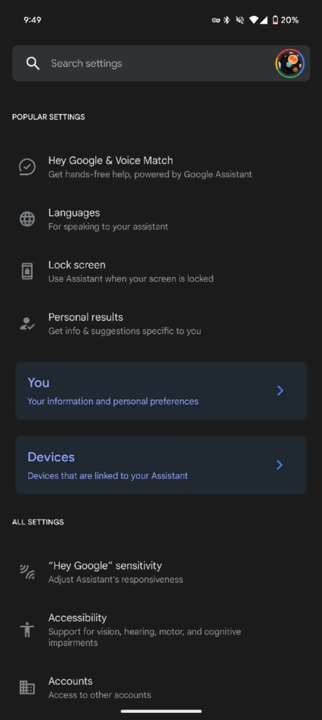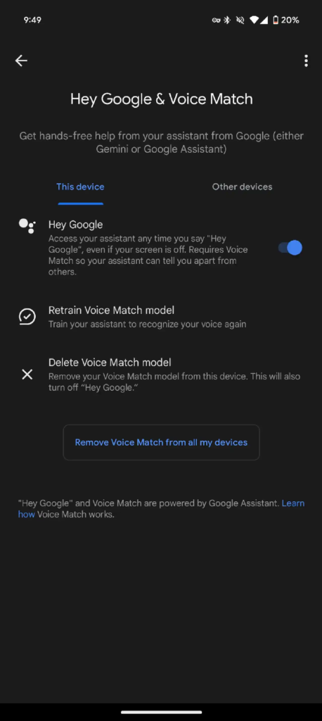 The change unifies all of the settings into a single toggle, simplifying them: “Hey Google” can be accessed through the Google Assistant settings > Hey Google & Voice Match.