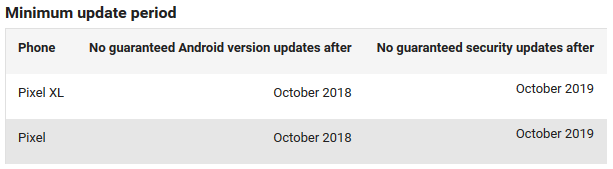 Google has updated it’s support website with end of service dates for Pixel and Pixel XL smartphones. Android update schedule for Pixel phones are mostly the same as with any Nexus device – Android OS version updates for two years, security updates for three years after the Google Store runs out of stock. So according to Android Support page, Both the Pixel and Pixel XL phones will receive guaranteed Android version updates through October 2018 and the security updates through October 2019.