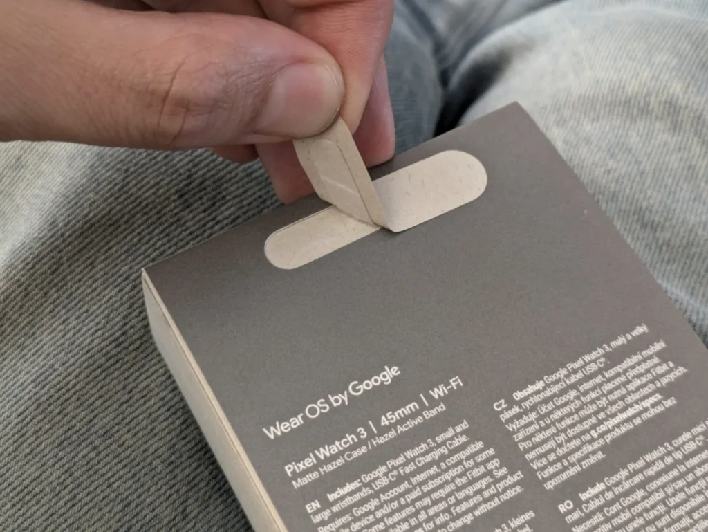 - Packaging Design: The Pixel Watch 3 arrives in a brown cardboard box, consistent with the design aesthetics of the new Pixel smartphones. The box is covered by a printed sleeve that showcases the watch and highlights its key features. To access the watch, users must remove a pill-shaped tab on the back of the sleeve.