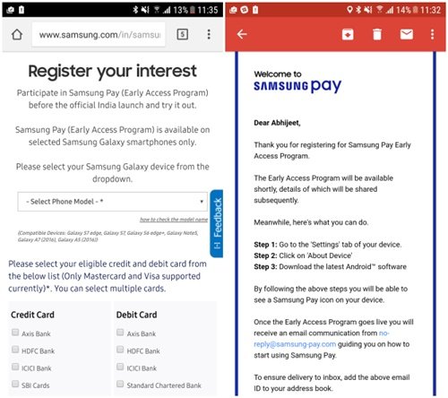 Registration can be done at the source link. You could face some error upon submitting details, so keep trying until the process completes. Some reports also say Samsung Pay website sis showing some problems with Chrome browsers. So one should avoid registering to the early access program through Chrome Web browser. Try some other browser for registration or simply complete the registration on your phone.